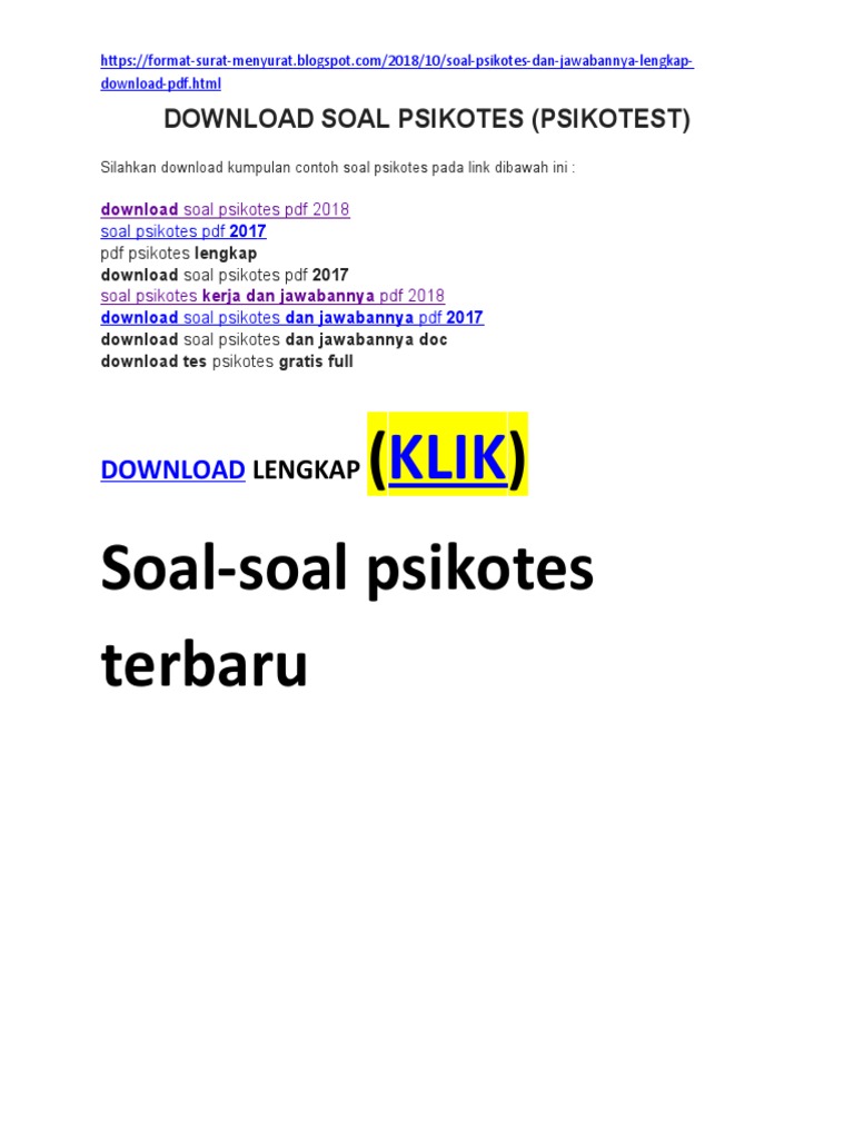Download kumpulan soal psikotes kerja dan jawabanya dalam format pdf yang akan saya bagikan untuk anda ini gratis dan freesilahkan anda unduh dan mendownloadnya untuk bahan belajar anda dalam rangka mempersiapkan diri mengikuti sikotes pekerjaan baik di sebuah perusahaan swasta ataupun bumn. Download contoh soal psikotes 2019 matematika gambar polri bank karayawan deret angka pdf cpns sma online dan jawabannya beserta pembahasannya lengkap. Contoh soal psikotes 2018 dan jawabannya materi tes matematika dasar.