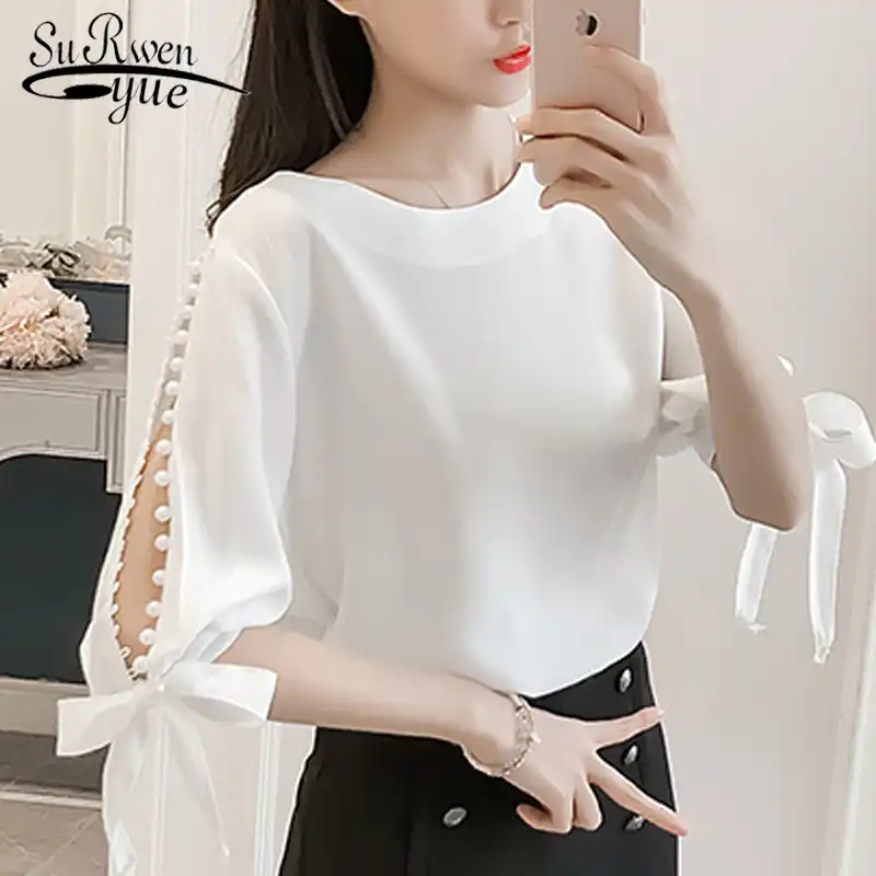 Fashion Wanita Blus 2021 Musim Panas Wanita Atasan Chiffon Wanita Blus Kemeja Putih Pink Manik Manik Feminin Blus Tops Blusas 0359 40 Blus Dan Kemeja Aliexpress